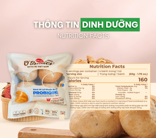 | Thành phần dinh dưỡng:  | Nguyên liệu: Bột mì, nước, hạt bí ngô xanh (10%), hạt hạnh nhân (5%), hạt óc chó (5%), sữa, muối i-ốt, men tự nhiên, nguyên liệu lợi khuẩn Probiotic EF-2001 (2mg/bánh tương đương khoảng 15 tỷ lợi khuẩn/bánh). Hạn sử dụng: 6 tháng kể từ ngày sản xuất |