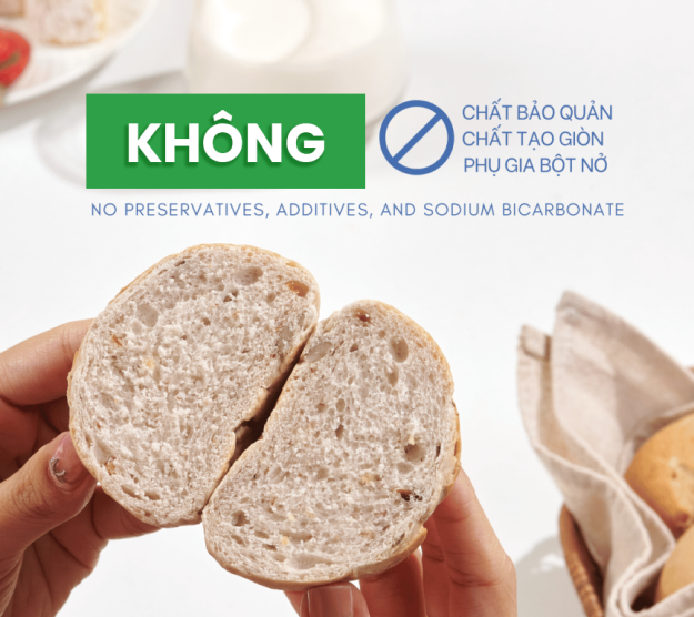- KHÔNG: chất kích nổi - chất tạo giòn - chất bảo quản - màu và hương liệu
