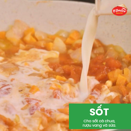 Cho sốt cà chua, rượu vang và sữa vào chảo đang xào.