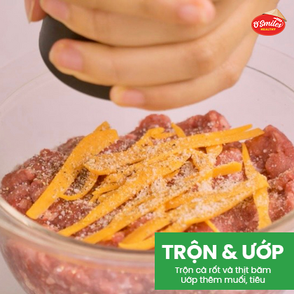 Trộn cà rốt cắt nguyễn với thịt băm sau đó nêm một chút muối.