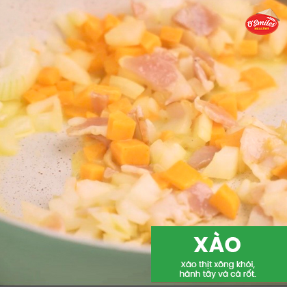 Xào thịt xông khói, hành tây và cà rốt.