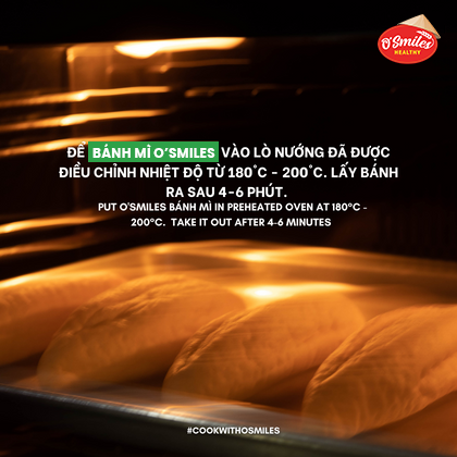 - Để bánh mì O'Smiles vào lò nướng đã được điều chỉnh nhiệt độ từ 210°C - 230°C. Đợi từ 4 đến 6 phút và lấy bánh ra khi đã chuyển màu vàng nâu.