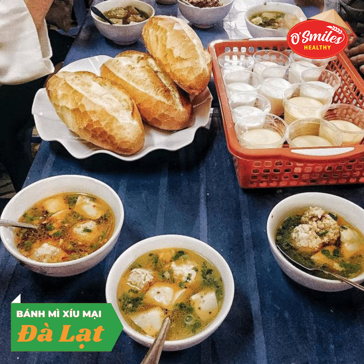 | Bánh Mì Xíu Mại Đà Lạt Chén xíu mại nóng hổi được phục vụ cùng với ổ bánh mì trong chiếc rỗ nhỏ bên cạnh. Có nhiều cách để thưởng thức món ăn bánh mì đặc sản của Đà Lạt này từ xé bánh mì thành từng miếng nhỏ để chấm vào nước sốt hoặc kẹp những viên xíu mại nhỏ vào bánh mì. |